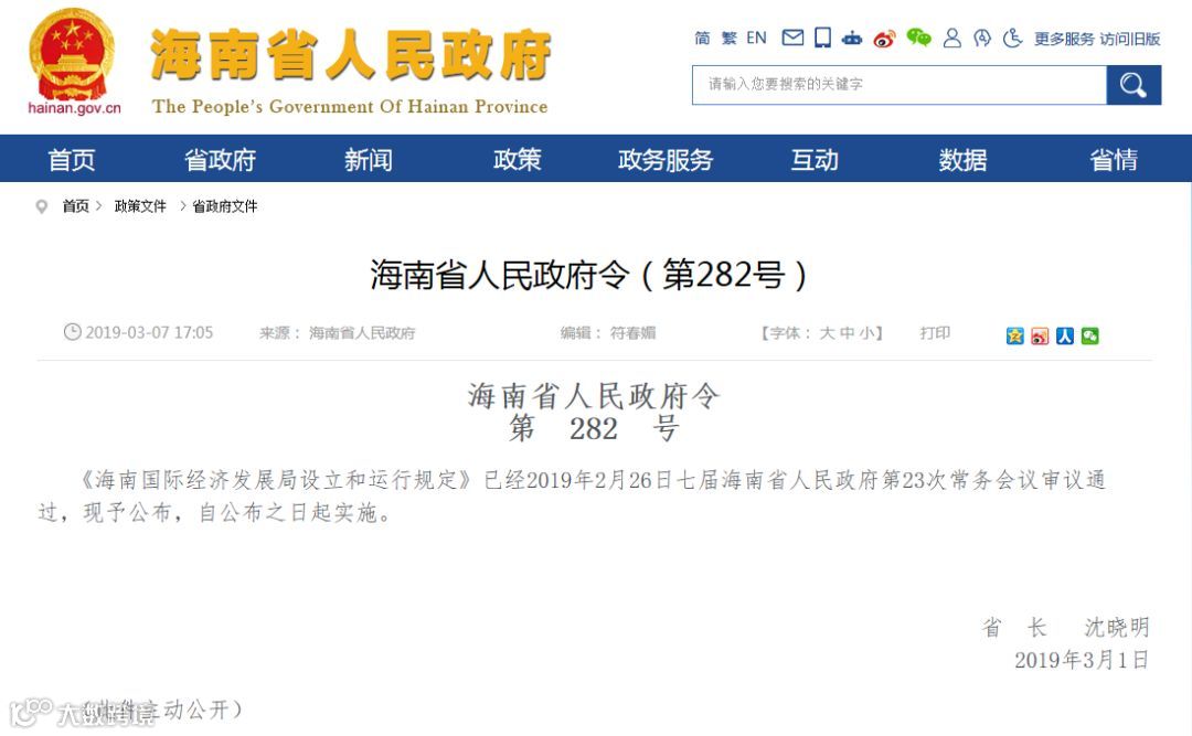 2019年3月1日,海南省人民政府正式发布《海南国际经济发展局设立和运行规定》(海南省人民政府令第282号),明确海南经发局的主要工作职责及运行模式。