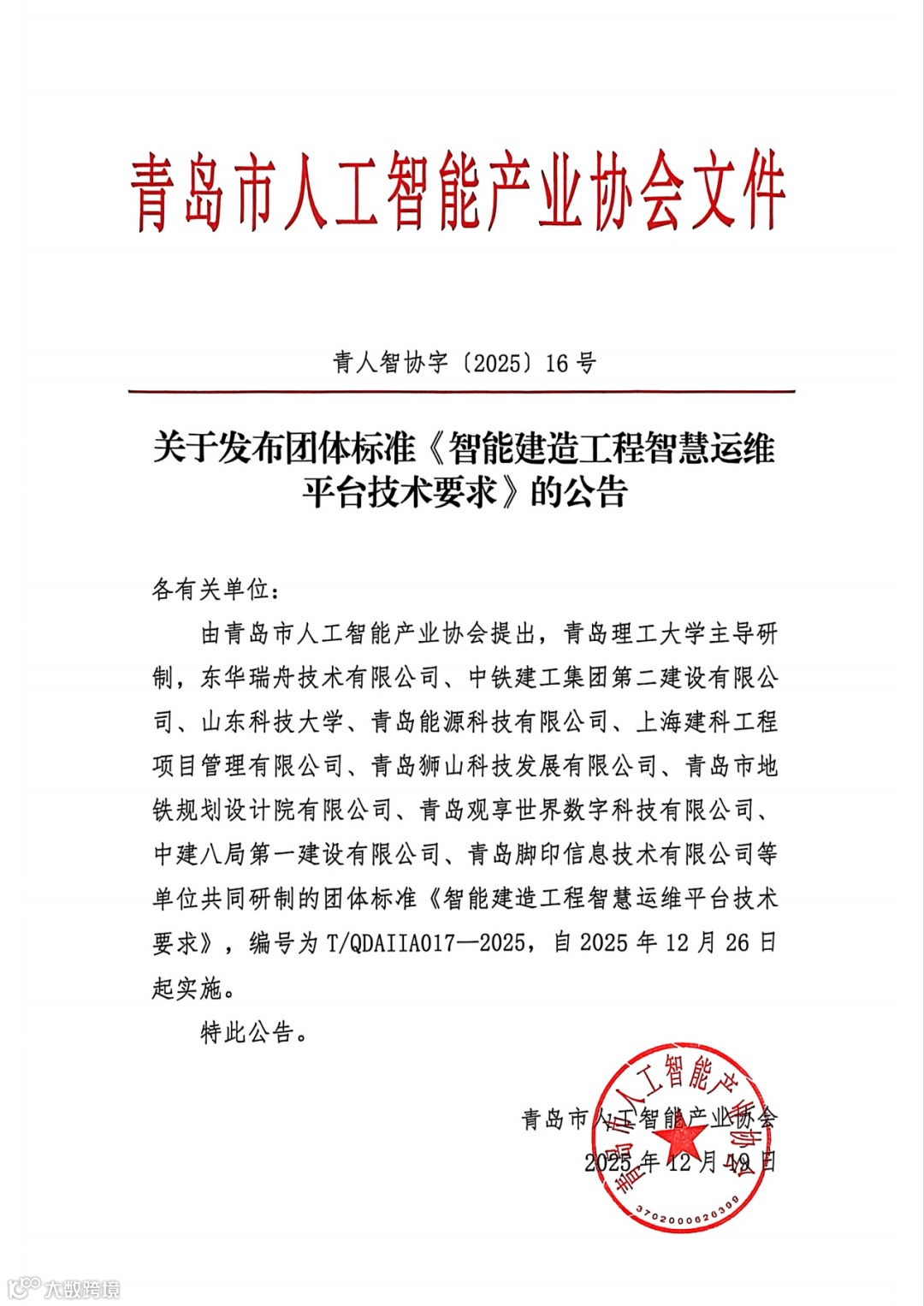 由青岛市人工智能产业协会提出,青岛理工大学主导研制,东华瑞舟技术有限公司、中铁建工集团第二建设有限公司、山东科技大学、青岛能源科技有限公司、上海建科工程项目管理有限公司、青岛狮山科技发展有限公司、青岛市地铁规划设计院有限公司、青岛观享世界数字科技有限公司、中建八局第一建设有限公司、青岛脚印信息技术有限公司等单位共同研制的团体标准《智能建造工程智慧运维平台技术要求》,编号为T/QDAIIA017—2025,自2025年12月26日起实施。