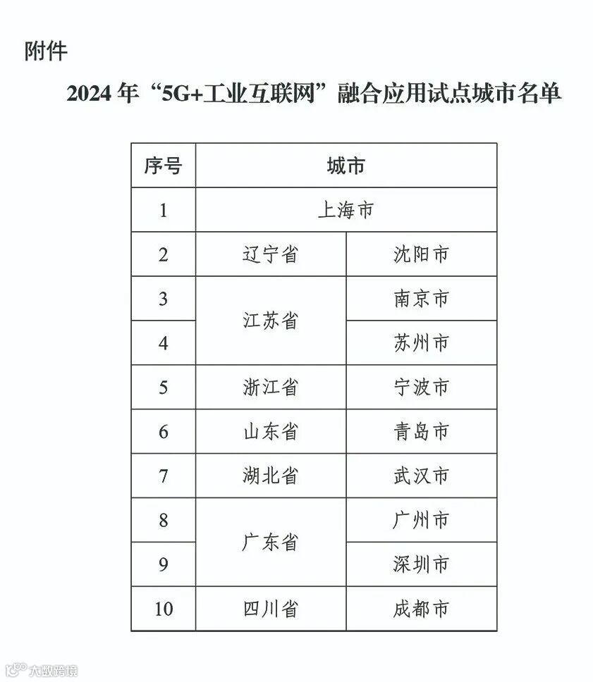 附件:2024年“5G+工业互联网”融合应用试点城市名单