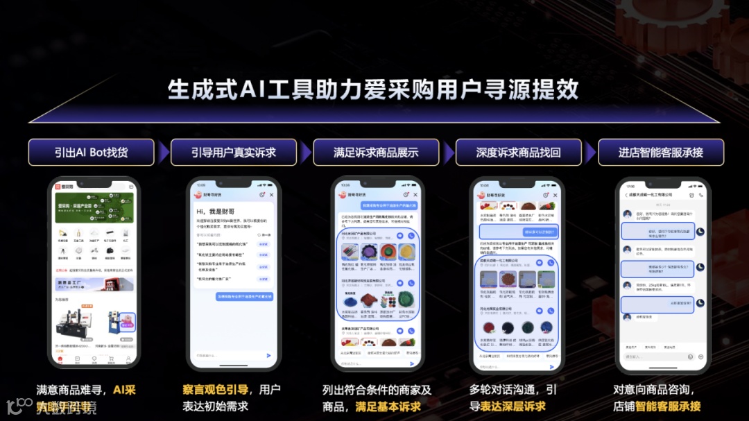 首先是商家经营提效。对商家来说,一直以来,工业品行业的理解成本高、询价需求复杂,低效的客户需求响应速度拖慢企业经营效率。针对该痛点崔燕谈到,未来,人工智能时代,雇佣AI员工已是大势所趋。为解决企业痛点,爱采购正在通过生成式AI重构线上商业采购场景的全链条。调用百度问答等专业知识为语料库,爱采购借助AI生成、物料制作能力,打通了专业智能接待全链条,通过机器人自由对话,能够实现7x24小时的实时响应,赋能商家经营提质增效。