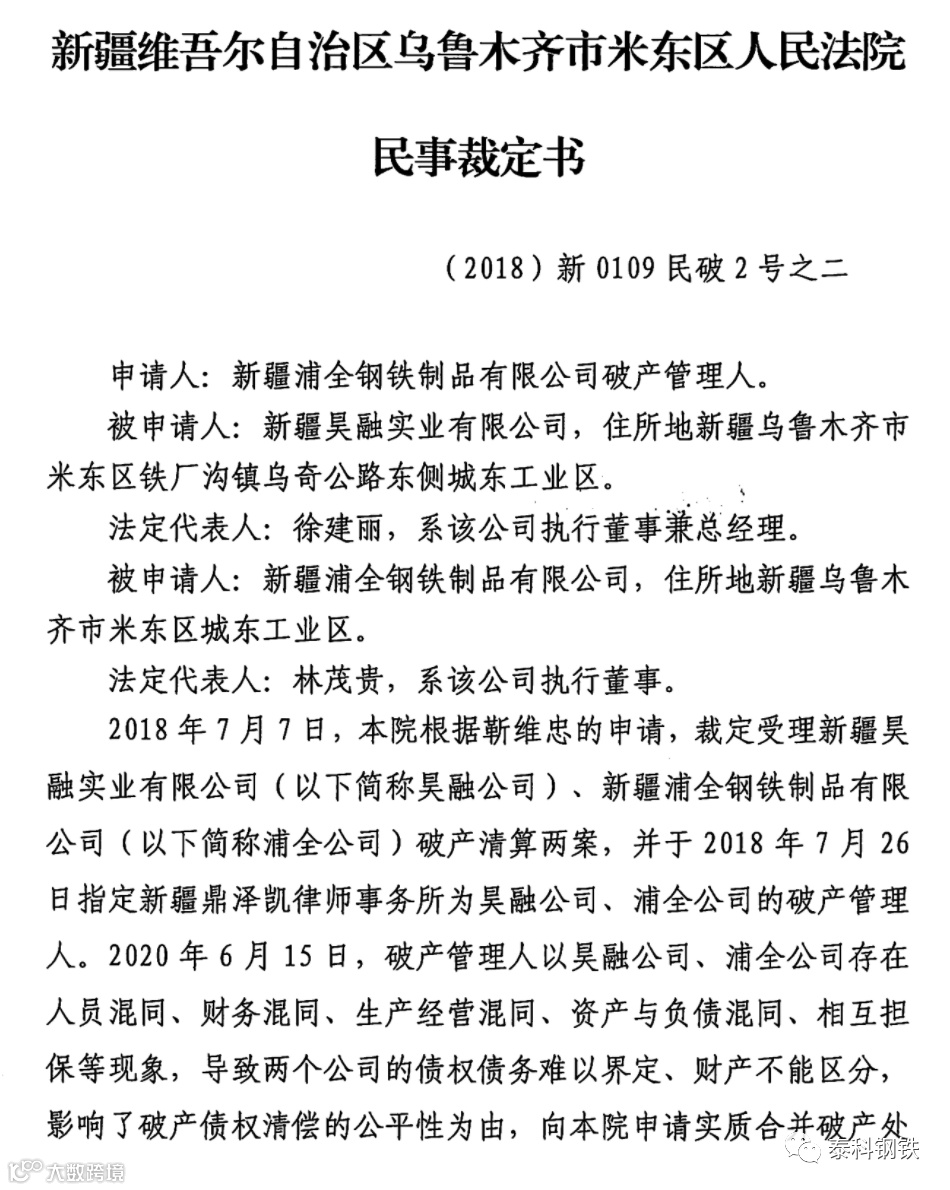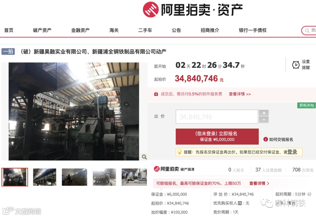 阿里拍卖网消息,新疆浦全钢铁制品有限公司破产清算,相关资产将于2021年7月2日上午10:00公开拍卖!