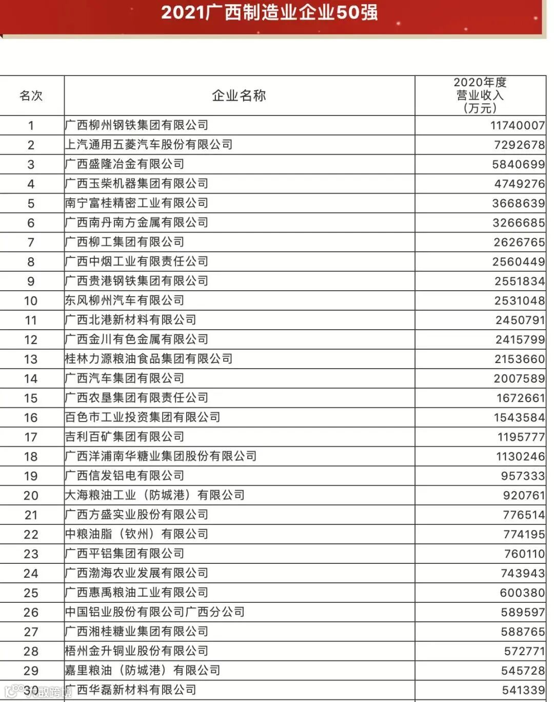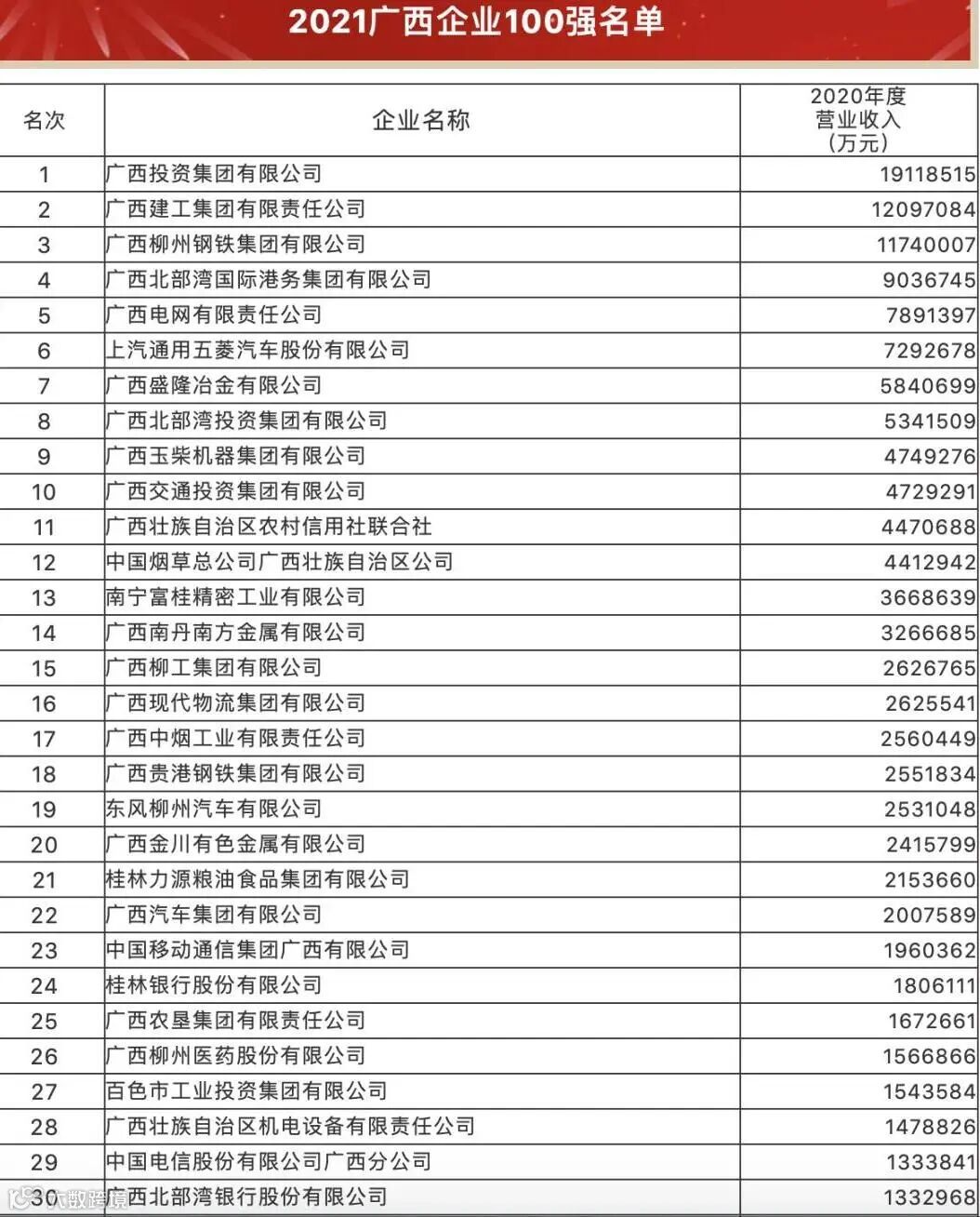 根据排名榜单显示,2021广西企业100强,柳钢集团位列第三位,其中广西投资集团有限公司、广西建工集团有限公司分列1~2位;钢铁行业入围的还有:北港新材料(母公司北港集团第4位),盛隆冶金(第7位),贵港钢铁(第18位),桂鑫钢铁(第61位),贵丰钢铁(第88位)。