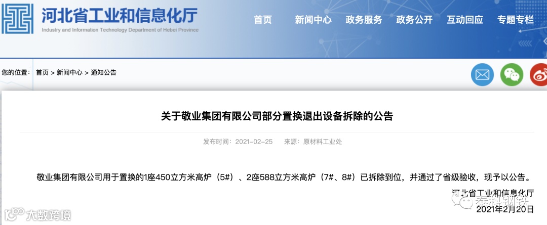 敬业集团有限公司用于置换的1座450立方米高炉(5#)、2座588立方米高炉(7#、8#)已拆除到位,并通过了省级验收,现予以公告。