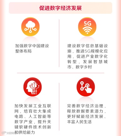 报告中提到,促进数字经济发展。加强数字中国建设整体布局。建设数字信息基础设施,推进5G规模化应用,促进产业数字化转型,发展智慧城市、数字乡村。加快发展工业互联网,培育壮大集成电路、人工智能等数字产业,提升关键软硬件技术创新和供给能力。完善数字经济治理,释放数据要素潜力,更好赋能经济发展、丰富人民生活。