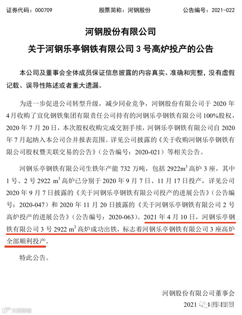 2021年4月10日,河钢乐亭钢铁有限公司3号2922m3高炉成功出铁,标志着河钢乐亭钢铁有限公司3座高炉全部顺利投产。
