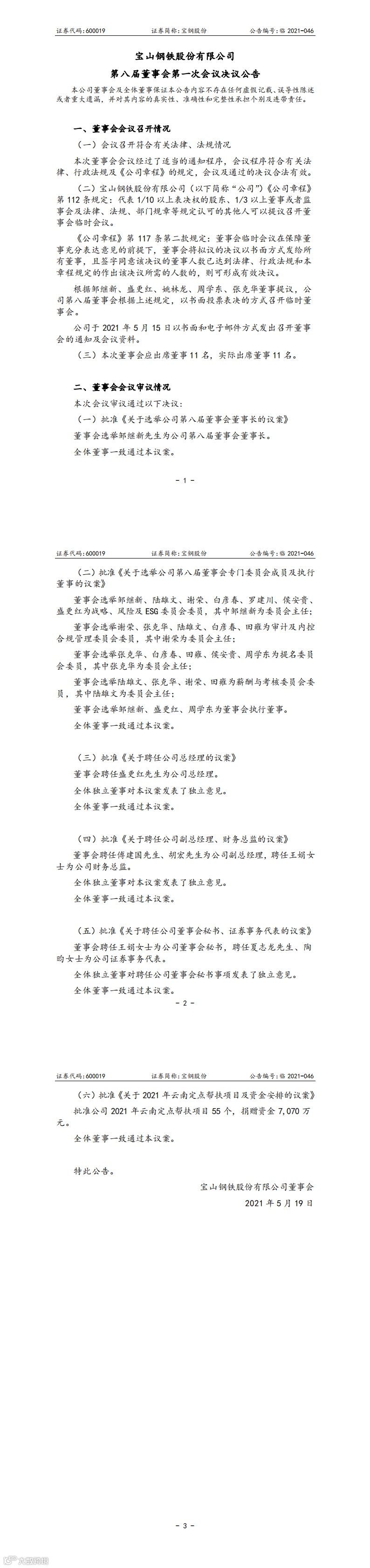宝钢股份发布的《第八届董事会第一次会议决议公告》显示,宝钢股份董事会选举邹继新为公司第八届董事会董事长;选举邹继新、盛更红、周学东为董事会执行董事。董事会聘任盛更红为公司总经理,聘任傅建国、胡宏为公司副总经理,聘任王娟为公司财务总监、董事会秘书,聘任夏志龙、陶昀为公司证券事务代表。