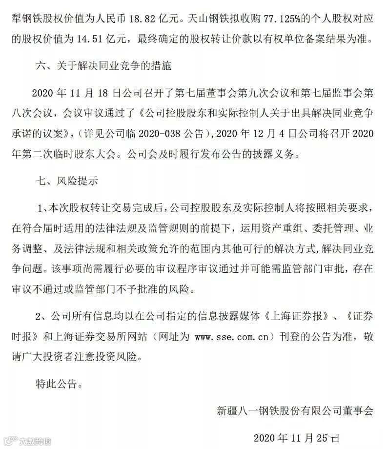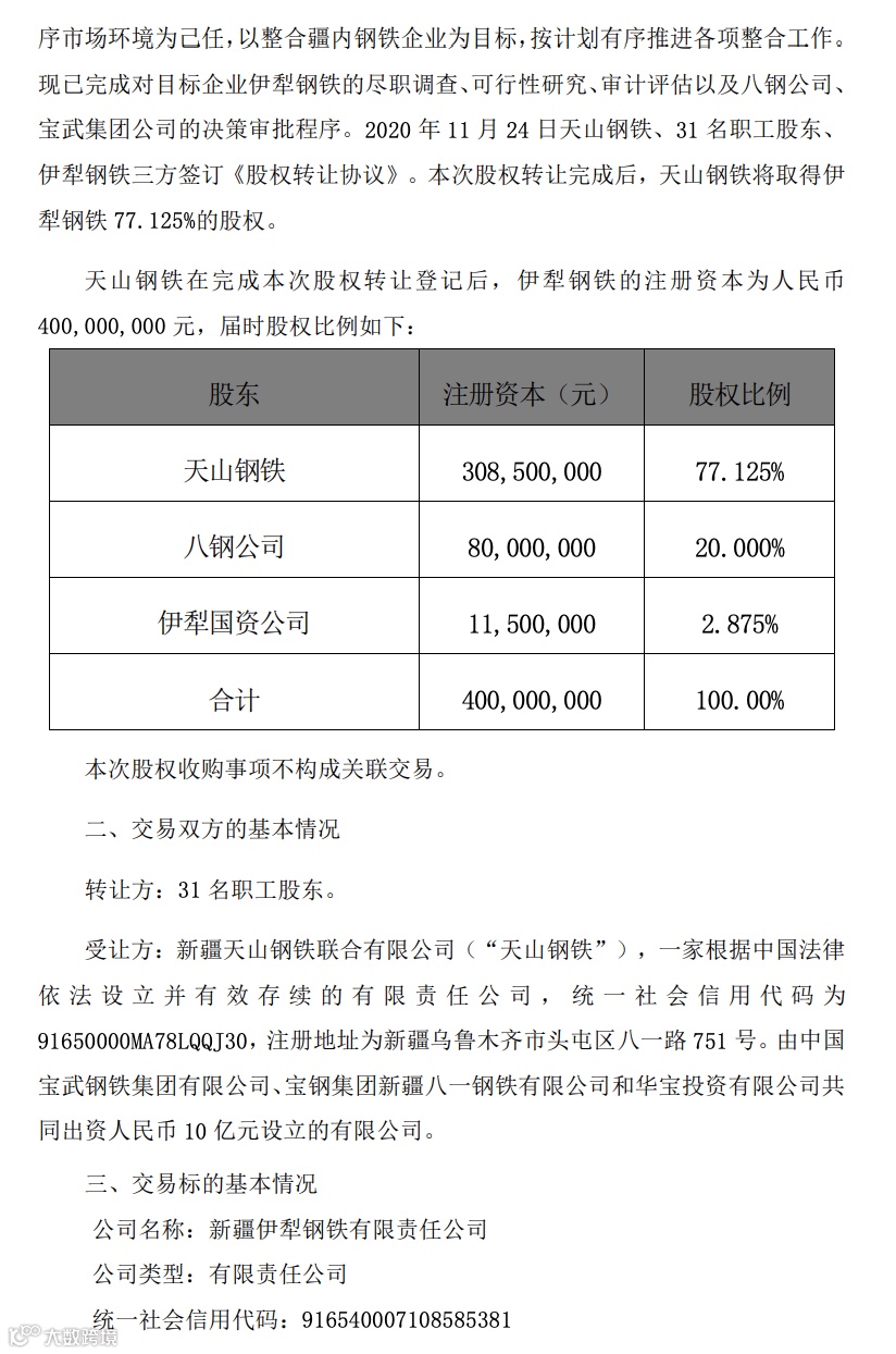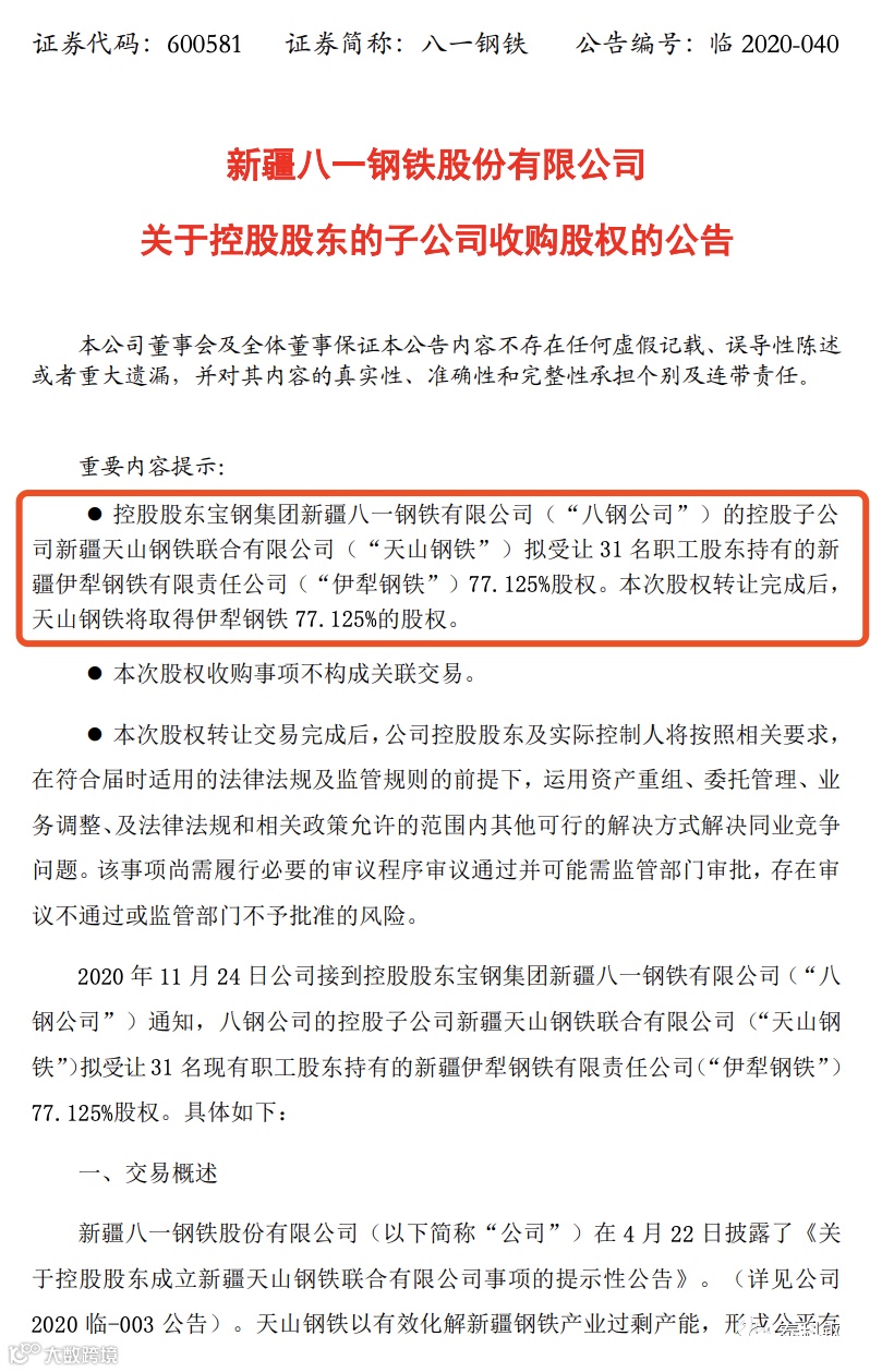 中国宝武再出手!刚刚,八一钢铁发布公告,控股股东宝钢集团新疆八一钢铁有限公司(“八钢公司”)的控股子公司新疆天山钢铁联合有限公司(“天山钢铁”)拟受让31名职工股东持有的新疆伊犁钢铁有限责任公司(“伊犁钢铁”)77.125%股权。此次股权转让完成后,天山钢铁将取得伊犁钢铁77.125%的股权。