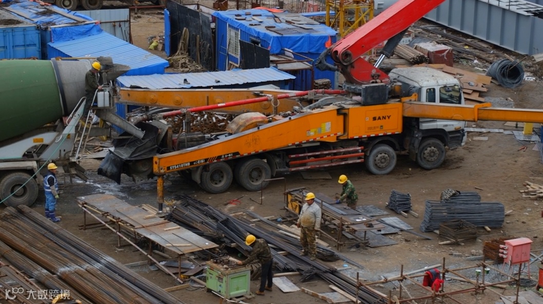 一辆辆工程车在工地上来回穿梭,鳞次栉比的钢筋框架厂房拔地而起,场面极其宏大;机器轰鸣,塔吊林立,建设者们忙碌的身影随处可见。