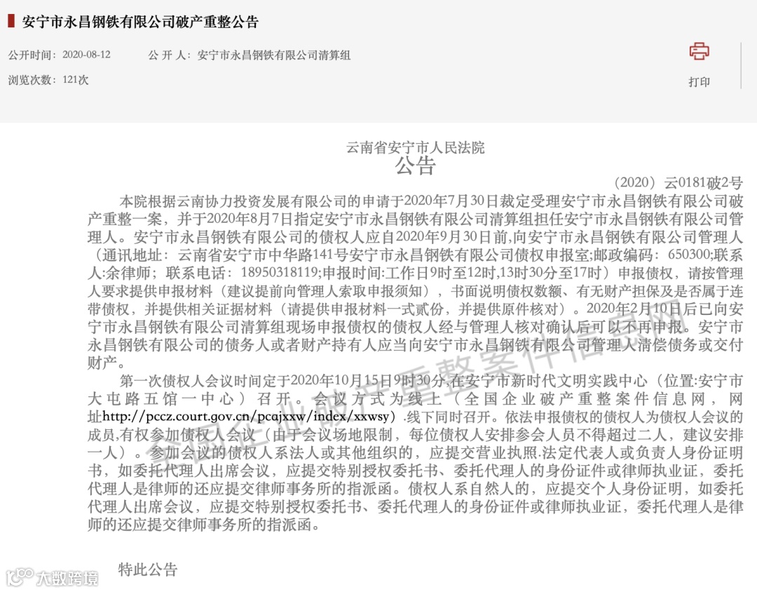 2020年8月12日,全国企业破产重整案件信息网发布公告,裁定安宁市永昌钢铁有限公司破产重整。第一次债权人会议时间定于2020年10月15日召开!