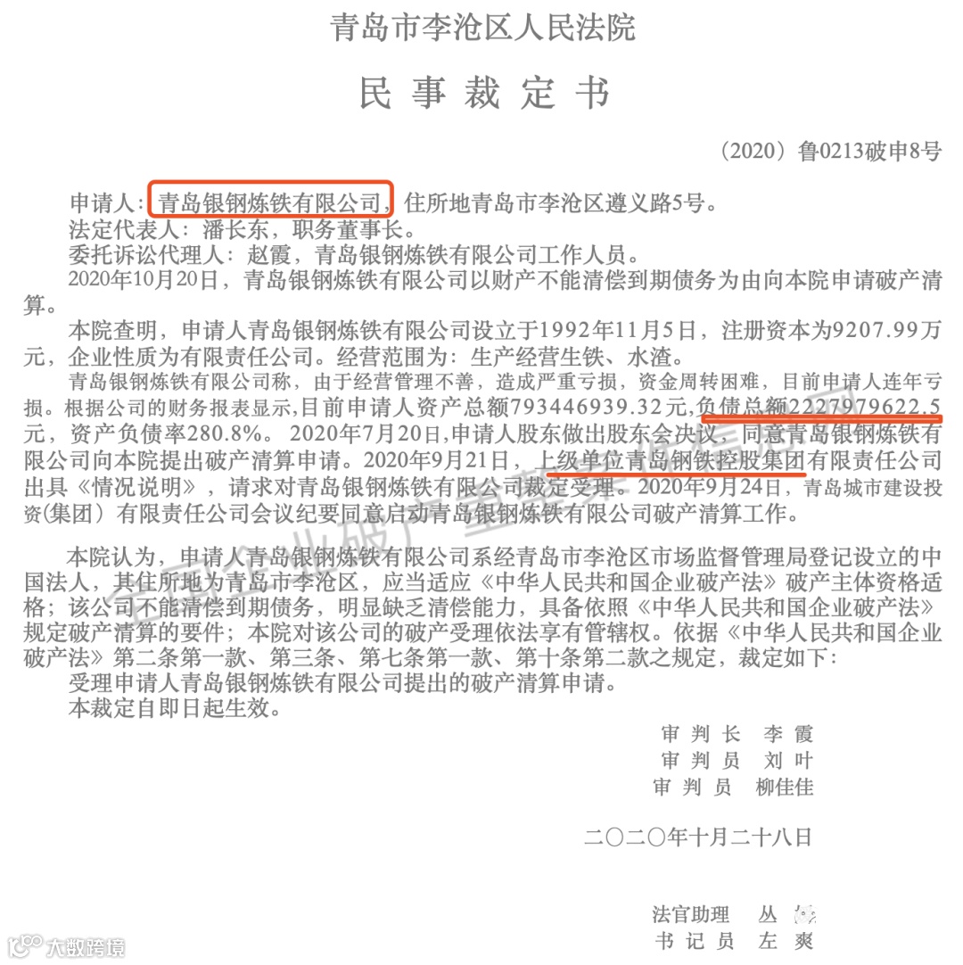2020年11月10日,全国企业破产重整案件信息网发布信息,受理申请人青岛银钢炼铁有限公司提出的破产清算申请。青岛银钢炼铁有限公司经营管理不善,造成严重亏损,资金周转困难,连年亏损,目前负债总额2227979622.5元(负债22.28亿),资产负债率280.8%。2020年7月20日,申请人股东做岀股东会决议,同意青岛银钢炼铁有限公司向本院提出破产清算申请。2020年9月21日,上级单位青岛钢铁控股集团有限责任公司出具《情况说明》,请求对青岛银钢炼铁有限公司裁定受理。2020年9月24日,青岛城市建设投资(集团)有限责任公司会议纪要同意启动青岛银钢炼铁有限公司破产清算工作。