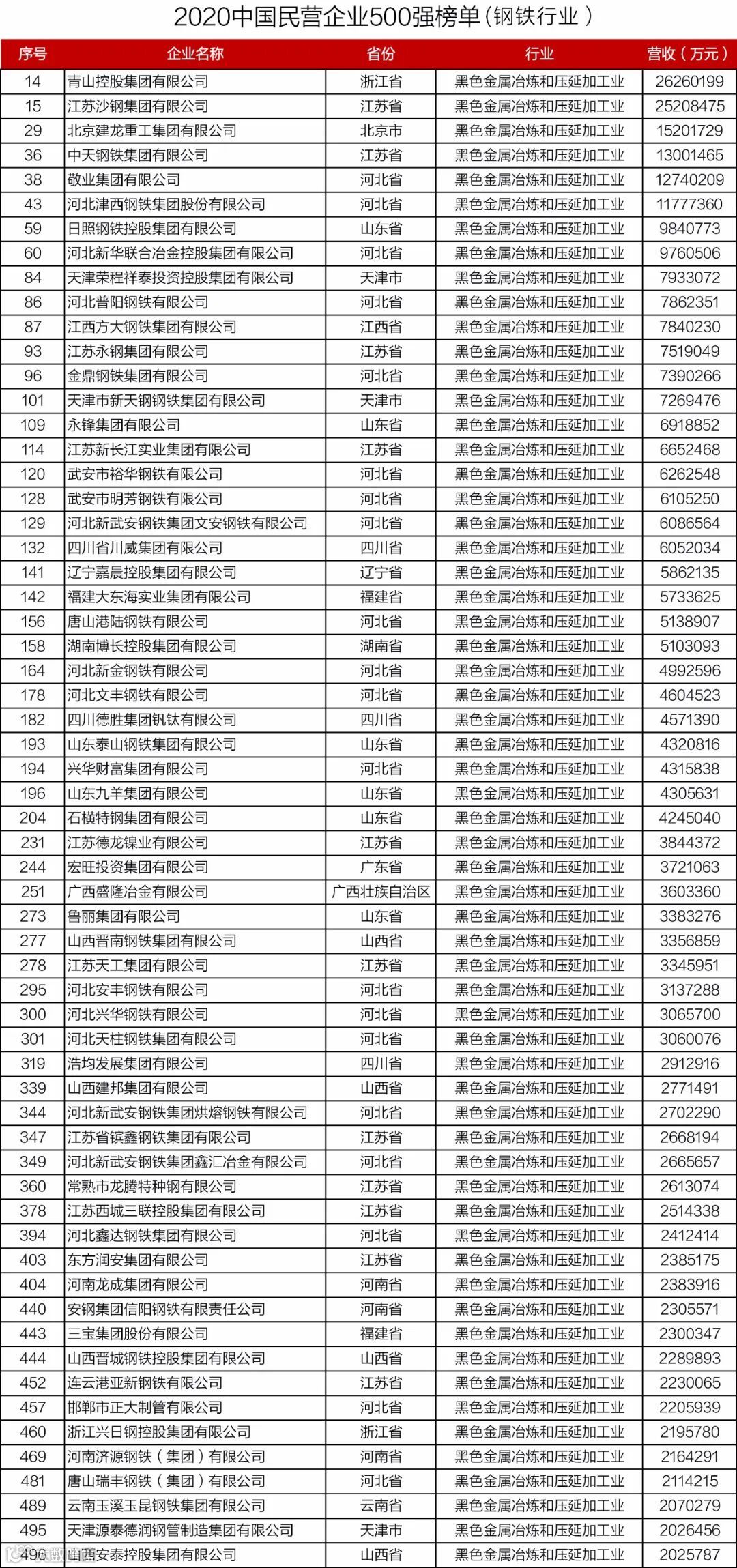 近日,全国工商联发布了2020中国制造业民营企业500强榜单,黑色金属冶炼和压延加工业继续位居入围企业数量榜首,为91家,【今日钢铁】小编整理如下: