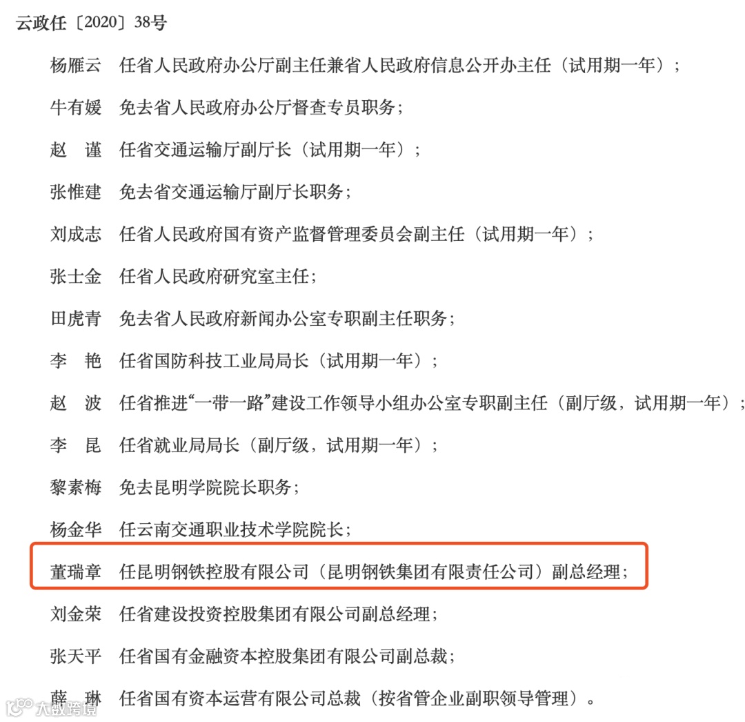 9月4日,云南省人民政府发布公告,董瑞章任昆明钢铁控股有限公司(昆明钢铁集团有限责任公司)副总经理。