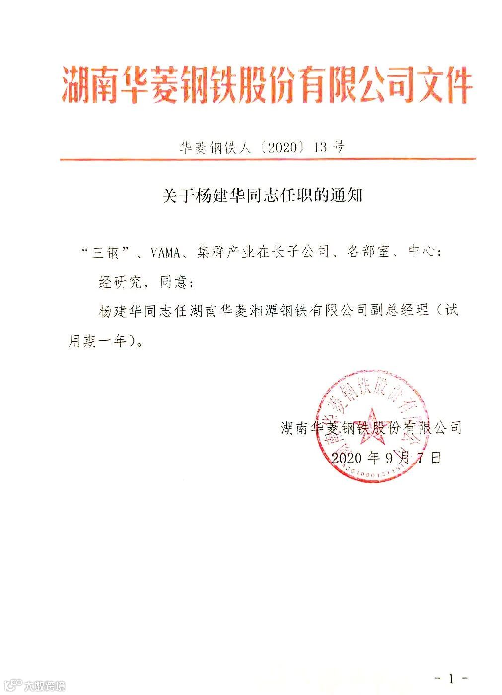 9月8日上午,华菱集团党委书记、董事长曹志强前来湘钢,宣读湖南华菱钢铁股份有限公司关于杨建华同志任职的通知:经研究,同意杨建华同志任湖南华菱湘潭钢铁有限公司副总经理(试用期一年)。