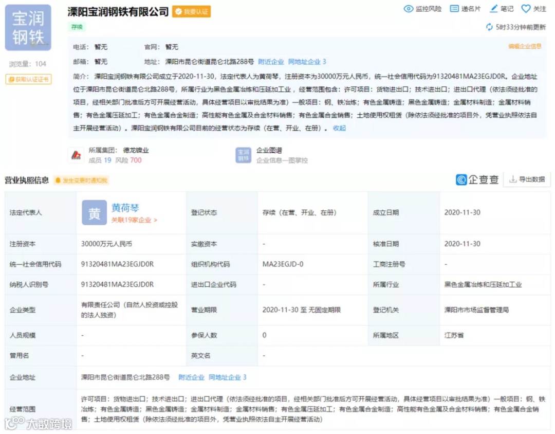 据企查查官网信息显示,2020年11月30日,溧阳宝润钢铁有限公司注册成立,江苏德龙镍业有限公司100%控股。