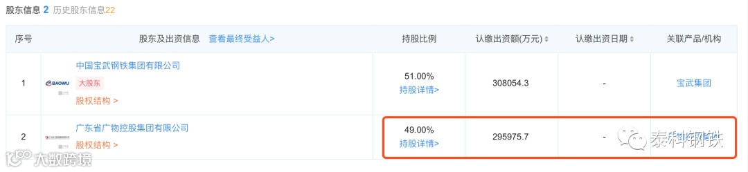中国宝武、广物集团合资成立的宝武集团中南钢铁,中国宝武占股51%,广物控股集团占股49%。