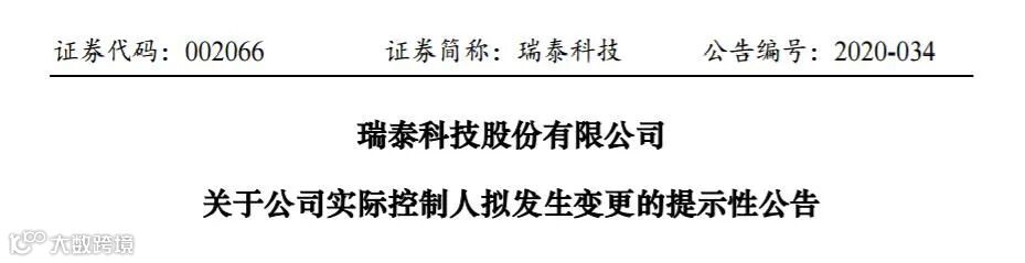 8月27日,瑞泰科技(002066.SZ)发布《关于公司实际控制人拟发生变更的提示性公告》(以下简称“《公告》”)。