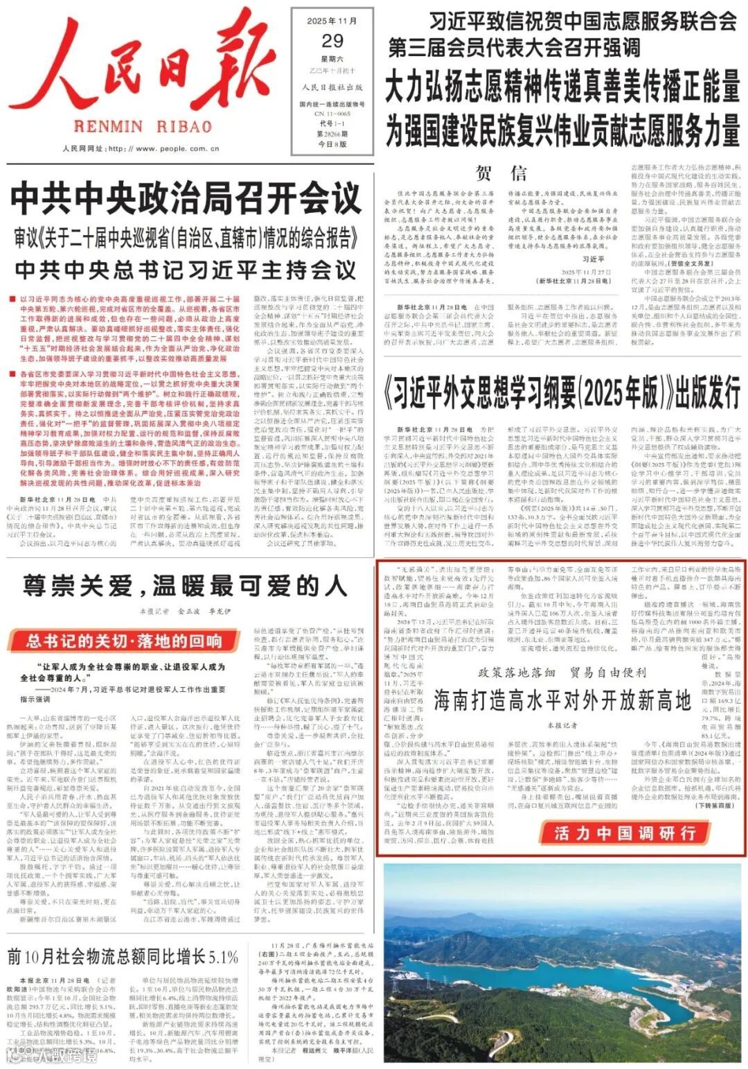 11月29日,《人民日报》头版刊发文章《海南打造高水平开放型经济新高地政策落地落细 贸易自由便利(活力中国调研行)》,版面图及全文如下:
