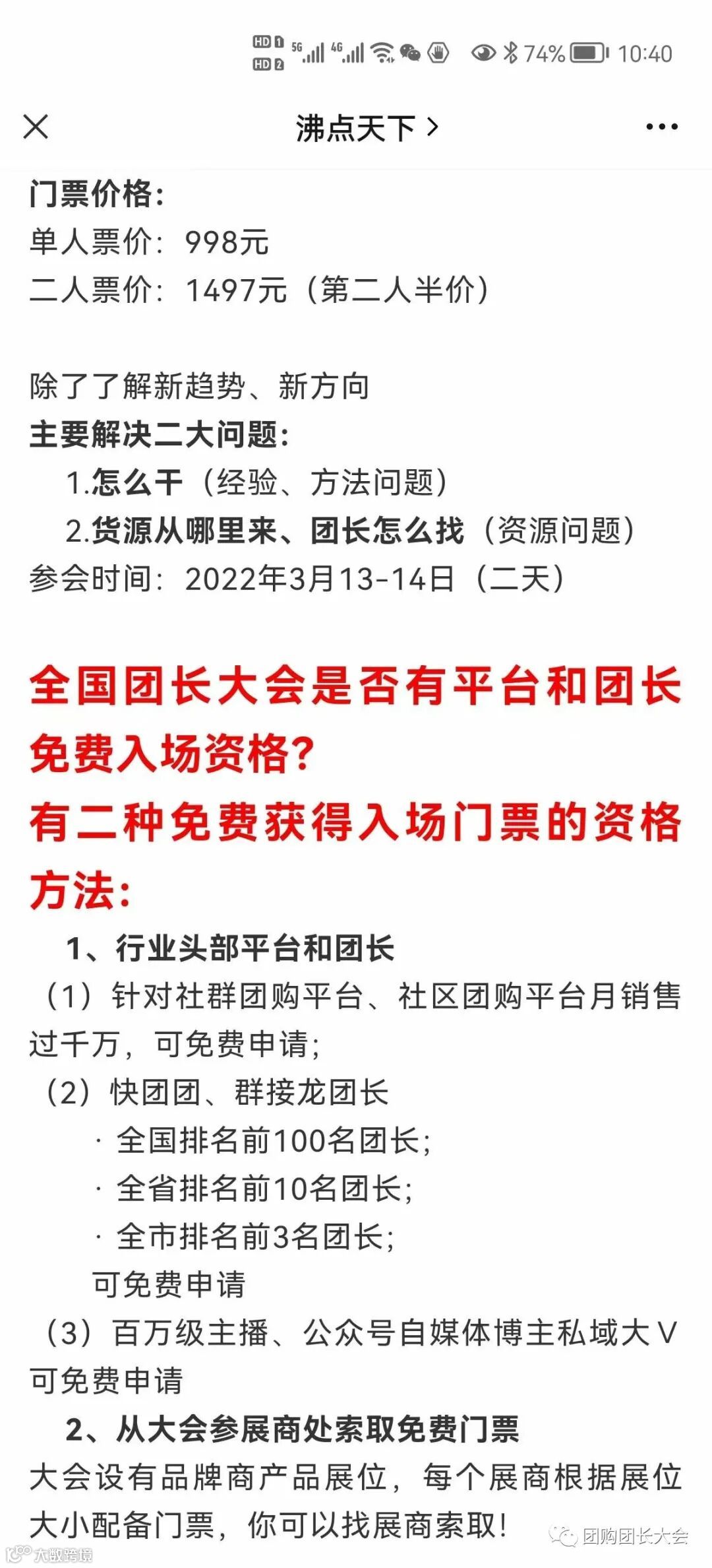 有人说:沸点门槛真高,入场门票就要收998元其实,沸点举办的万人团长大会“针对这10000名团长是免费的”只是买票的都是成长中的学费为了,一下跳上一个台阶的“跳板”否则当下是,伸手够不着的