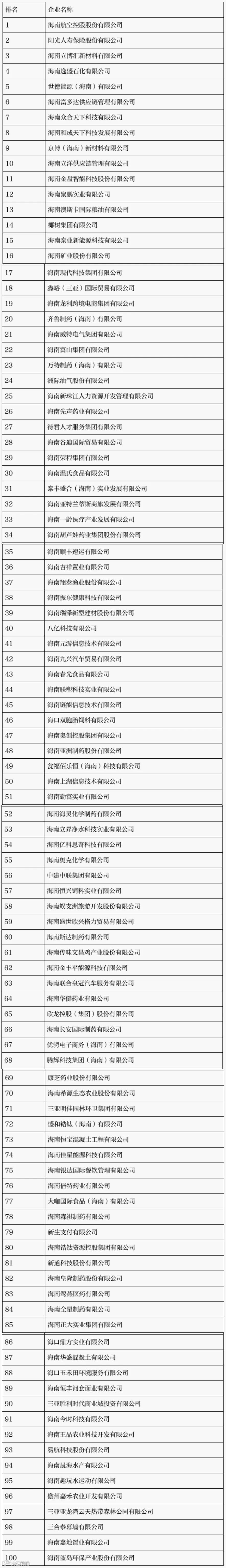 2025海南民营企业100强榜单
