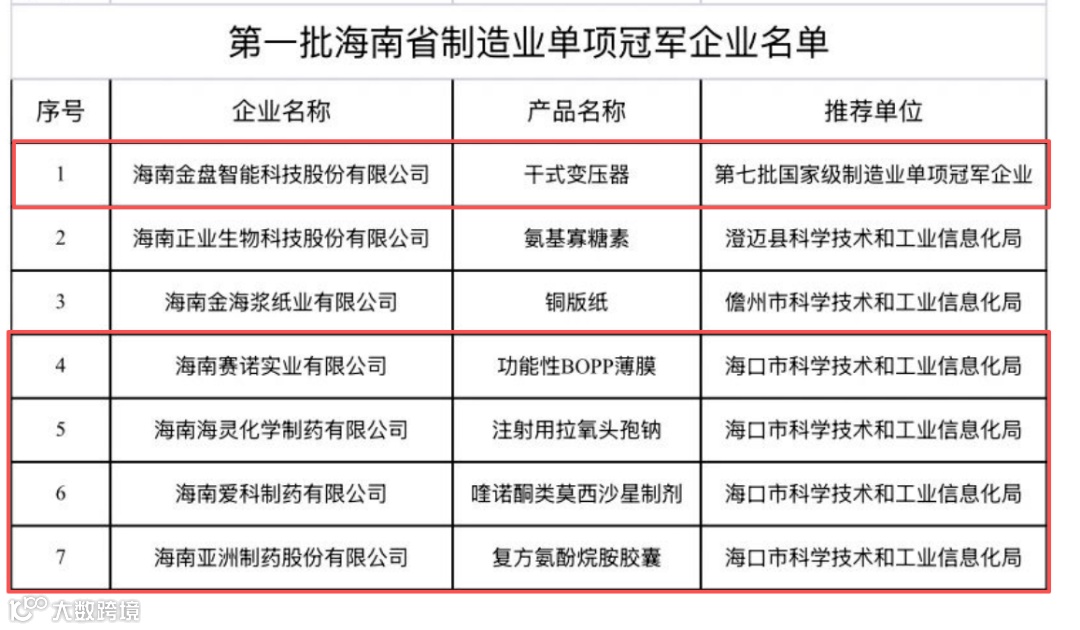 从名单来看,首批7家单项冠军企业产业分布多元,覆盖生物医药、高端装备制造、新材料、造纸等海南重点培育的制造业领域,其中海口市企业占5家,澄迈县、儋州市各1家,海南金盘智能科技股份有限公司作为第七批国家级制造业单项冠军企业入选,成为我省制造业迈向高端化、智能化的典型代表。