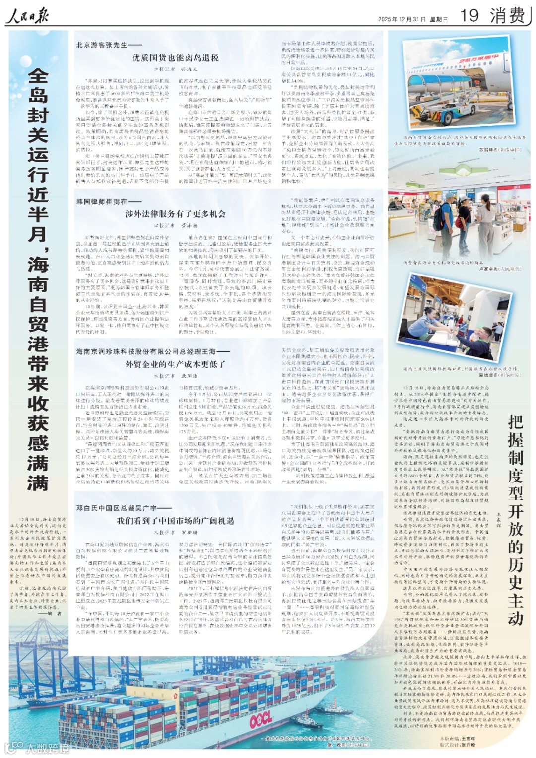 12月18日,海南自贸港正式启动全岛封关,迈向更高水平对外开放新阶段,一系列惠企利民政策扩容落地。封关运行将近半月,消费者在免税店内刷新购物体验;外国来华工作者爱上在海南的工作和生活;岛内本土企业迎来发展新机遇;外资企业看好在中国的发展未来。