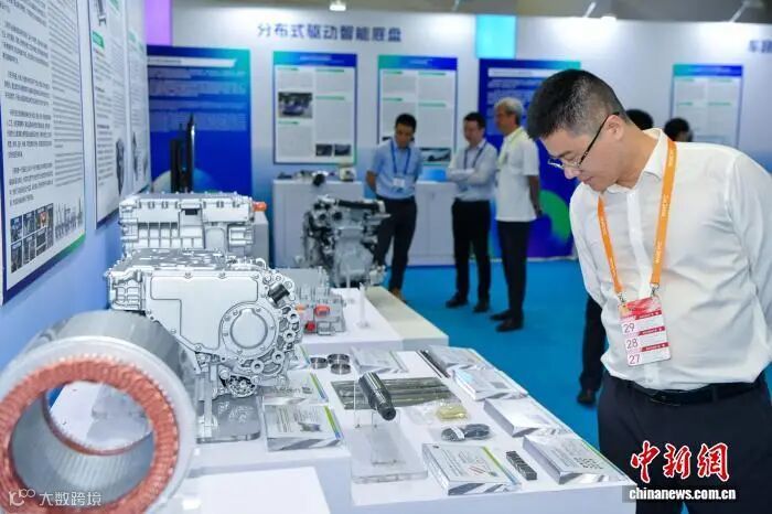 2025世界新能源汽车大会展出的新能源汽车零部件吸引参观者。中新社记者 骆云飞 摄