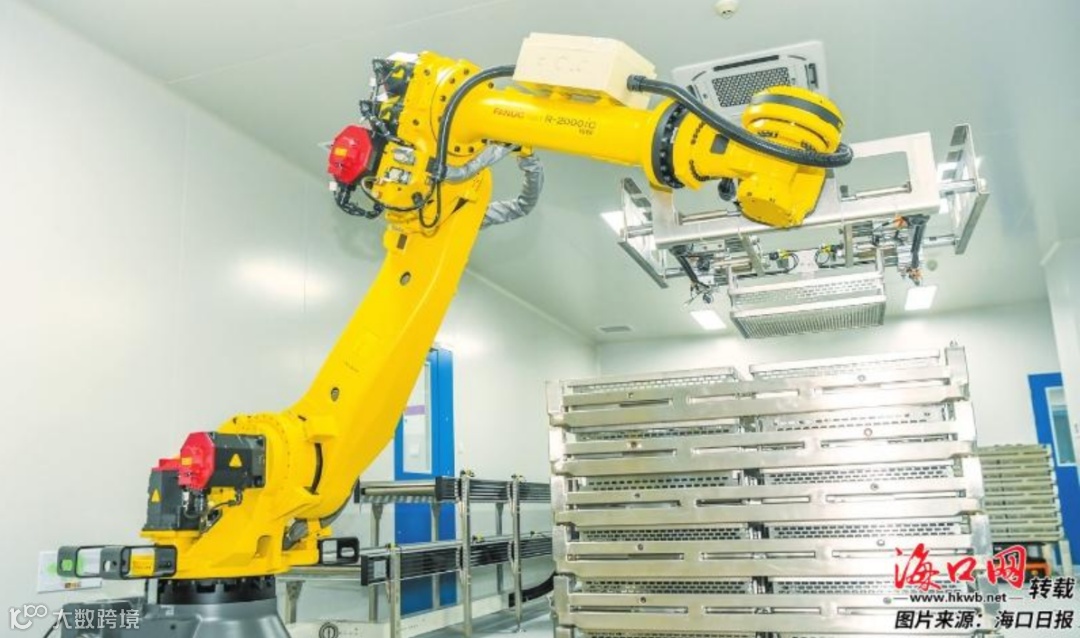 在海口药谷工业园的海南皇隆制药股份有限公司内,机械手臂将已装筐的药剂转移至托盘。记者 康登淋 摄