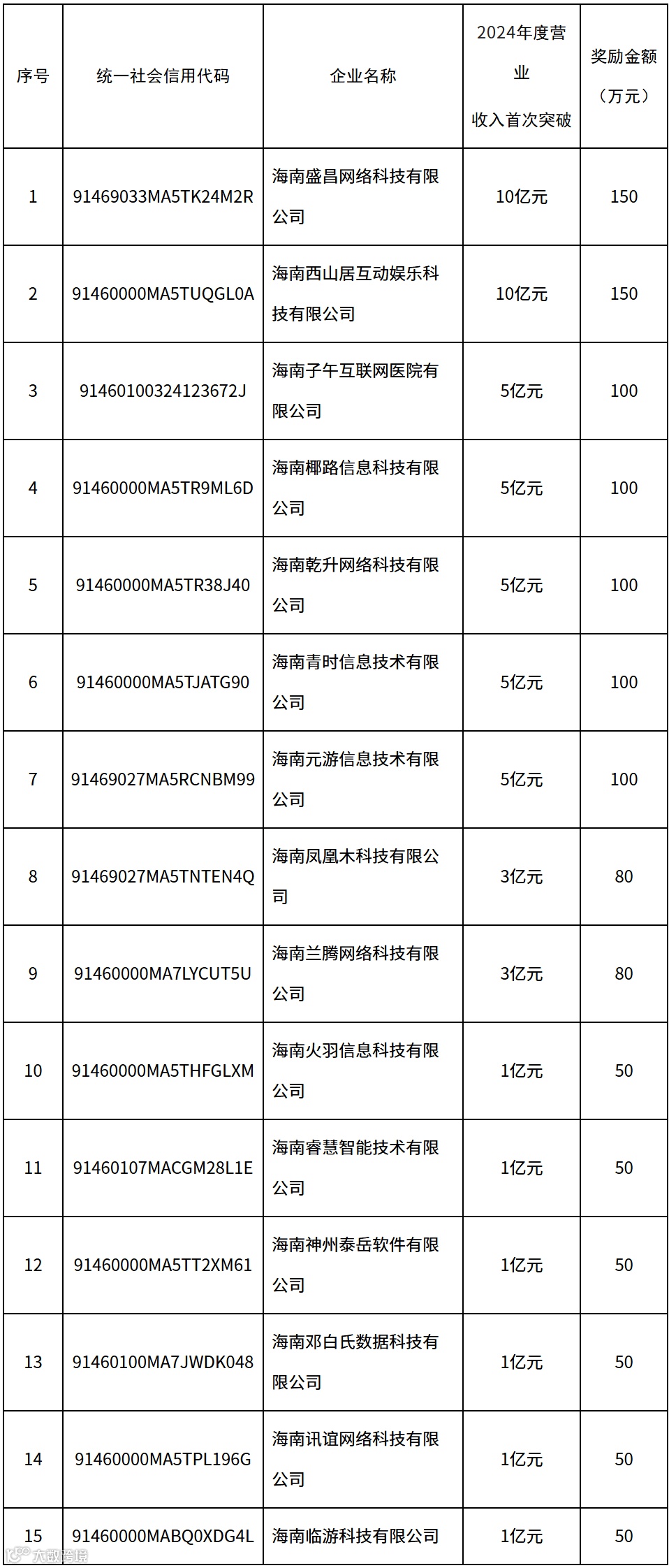 根据名单,海南邓白氏数据科技有限公司、海南乾升网络科技有限公司、海南兰腾网络科技有限公司、海南睿慧智能技术有限公司、海南讯谊网络科技有限公司等5家海口企业拟将共获330万元奖金。上榜企业主要分布于信息技术、软件开发、互联网、大数据等行业领域。