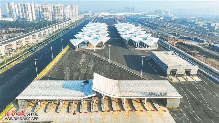 往北,海南自贸港封关运作重点项目——海口南港“二线口岸”普铁旅客查验设施建设工程完工,新建的站房楼顶挂上新门头,“南港站”红色招牌十分醒目。