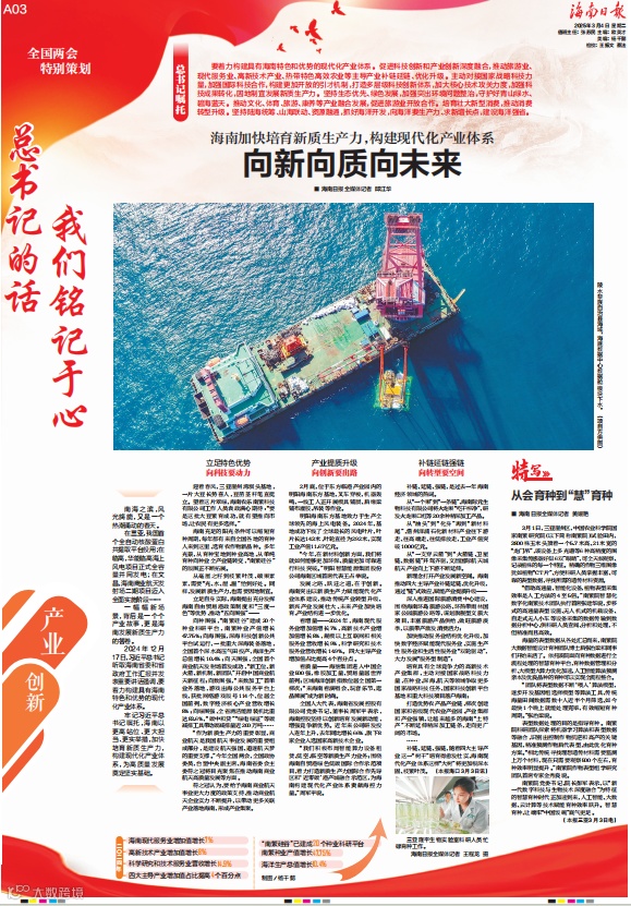 牢记习近平总书记嘱托,海南以更高站位、更大担当、更实举措,加快培育新质生产力,构建现代化产业体系,为高质量发展奠定坚实基础。