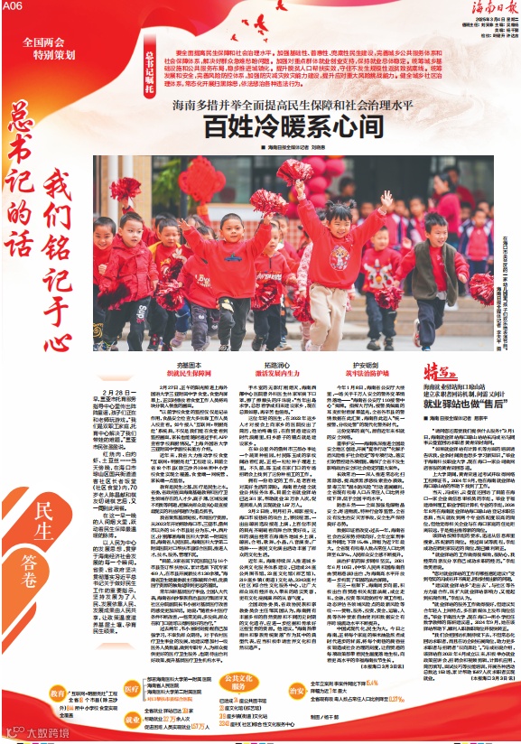 以人民为中心的发展思想,贯穿于海南经济社会发展的每一个瞬间。省委、省政府坚决贯彻落实习近平总书记关于做好民生工作的重要指示,坚持发展为了人民、发展依靠人民、发展成果由人民共享,让政策温度滋养基层土壤、孕育民生硕果。