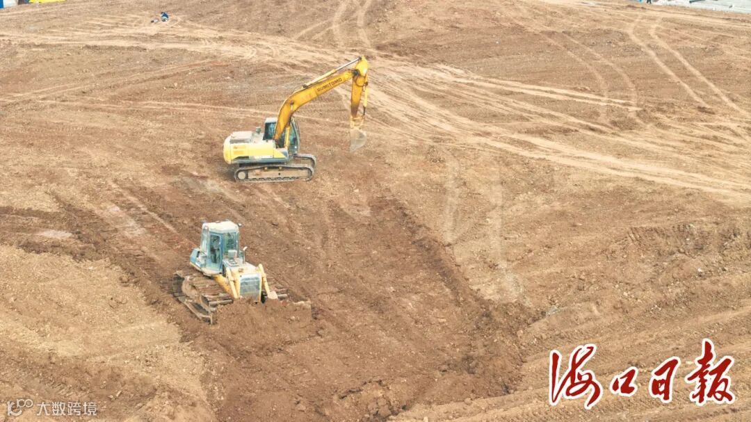 4月18日,空中俯瞰位于美安生态科技新城的农夫山泉天然饮用水及饮料生产基地项目,工人正驾驶机械设备整备场地。海口市融媒体中心记者 康登淋 摄