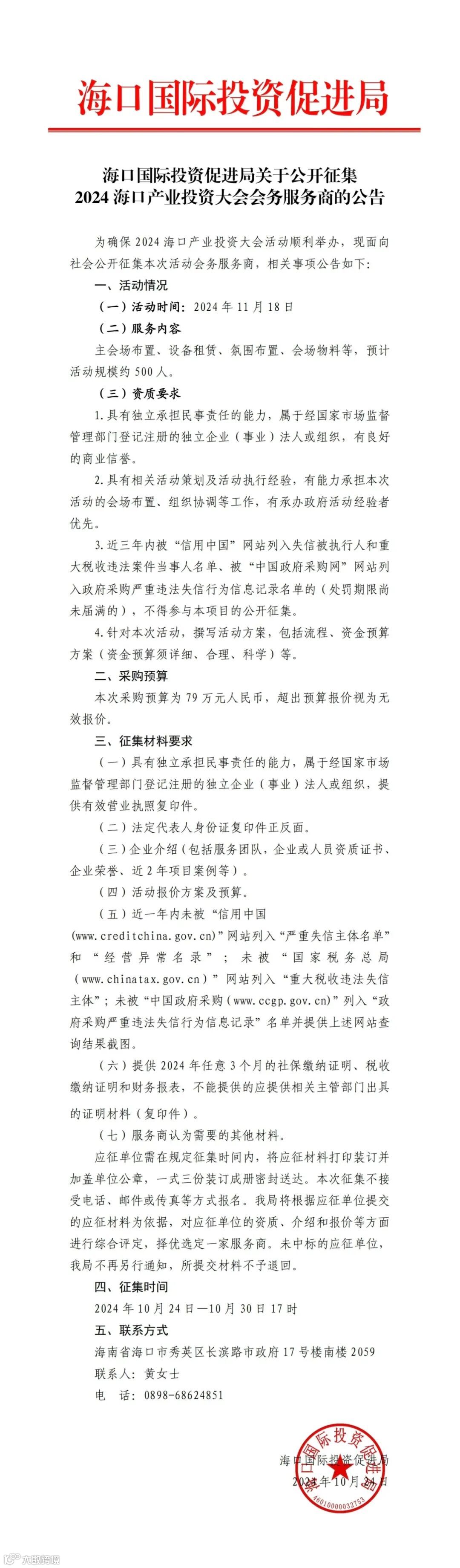 海口国际投资促进局关于公开征集2024海口产业投资大会会务服务商的公告
