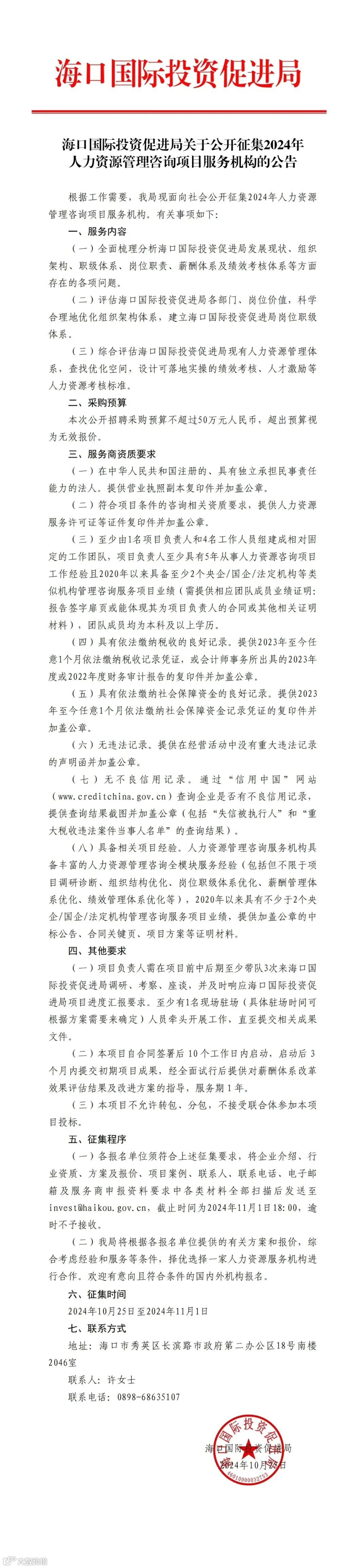 海口国际投资促进局关于公开征集2024年人力资源管理咨询项目服务机构的公告