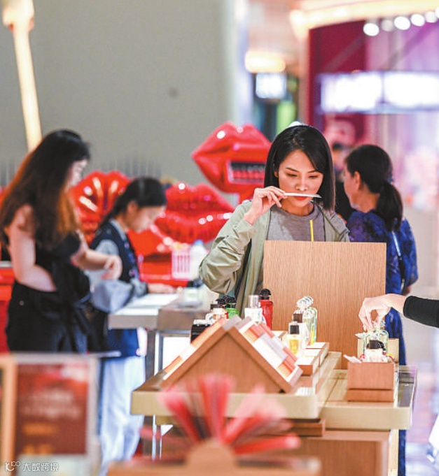 游客在海控全球精品免税城内选购商品。经过多年发展,离岛免税购物已经成为海南旅游消费市场的“金字招牌”。目前,海南离岛免税店已增加到12家,实现了飞机、轮船、火车三种离岛方式全覆盖。胥圣兰 摄(人民视觉)