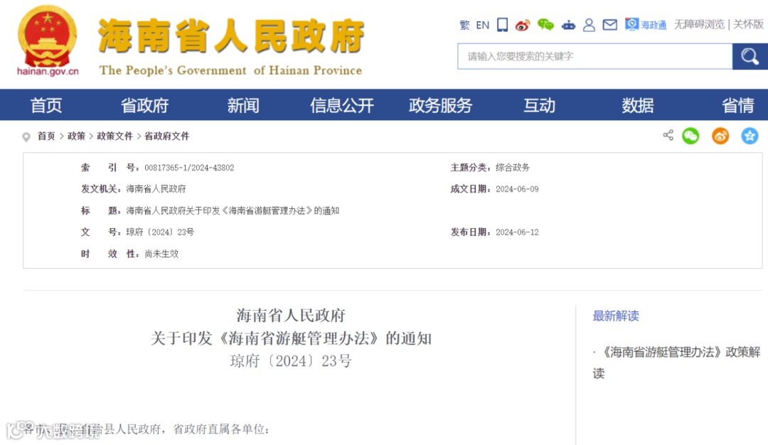 关于印发《海南省游艇管理办法》的通知
