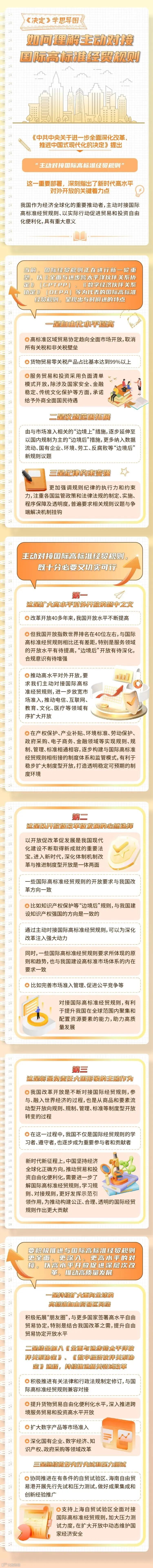 《中共中央关于进一步全面深化改革、推进中国式现代化的决定》提出:“主动对接国际高标准经贸规则”。这一重要部署,深刻指出了新时代高水平对外开放的关键着力点。我国作为经济全球化的重要推动者,主动对接国际高标准经贸规则、以实际行动促进贸易和投资自由化便利化,具有重大意义。
