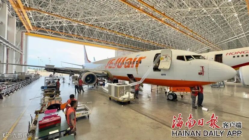 近日,海南日报记者来到海南自贸港一站式飞机维修产业基地。在1号大修定检机库内,几名机务维修人员正在对一架济州航空公司波音737-800飞机开展检修工作,这是海南承接的首单韩国进境飞机维修业务。