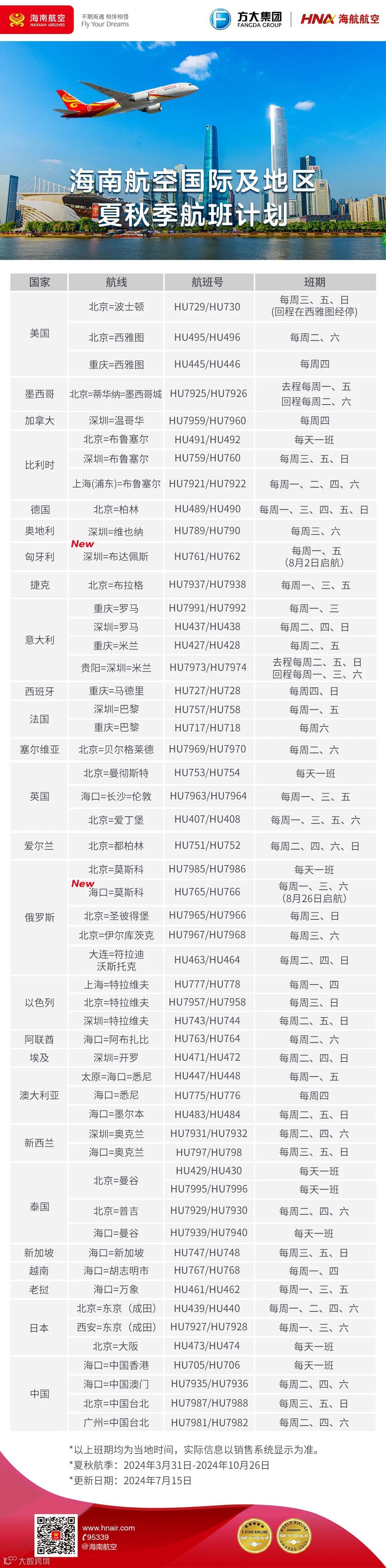 截至目前,海南航空已恢复、新开及计划运营北京、上海、深圳、海口、重庆、西安、长沙、太原、大连、广州、杭州等城市出港的50余条国际及地区往返客运航线。后续,海南航空将继续加快国际及地区航线的复航及开航工作,以满足全球旅客的出行需求。
