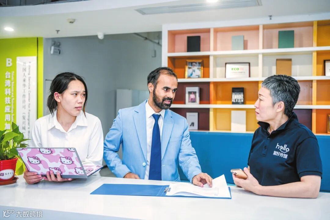 在国际离岸创新大厦内,工作人员与外商进行商谈。海口日报记者 苏弼坤 摄