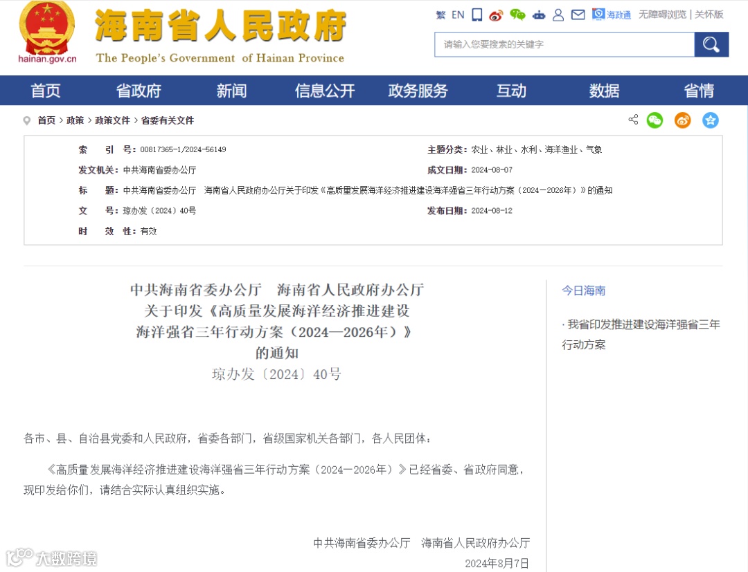 8月12日,省委、省政府联合印发《高质量发展海洋经济推进建设海洋强省三年行动方案(2024—2026年)》(以下简称《方案》),提出推进七项重点任务加快海洋经济高质量发展,2026年海洋生产总值在全省GDP占比要达到40%。