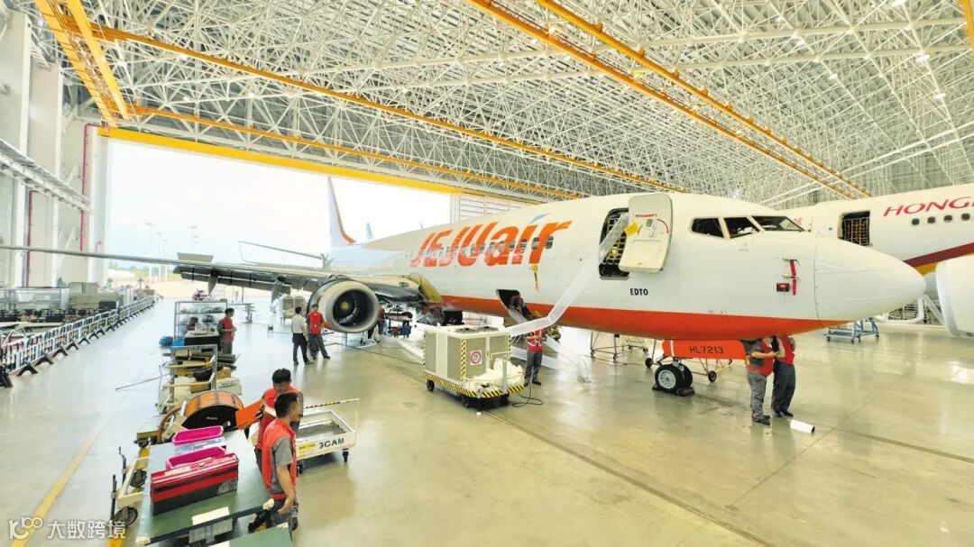 近日,在海南自贸港一站式飞机维修产业基地定检机库内,一架来自韩国济州航空公司的波音737-800飞机正接受专项维修服务。