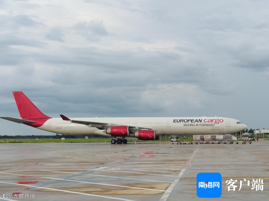 一批化妆品搭乘由英国欧洲货运航空公司运营的全货机航班,从海口美兰国际机场飞往英国伯恩茅斯机场。海口美兰机场供图