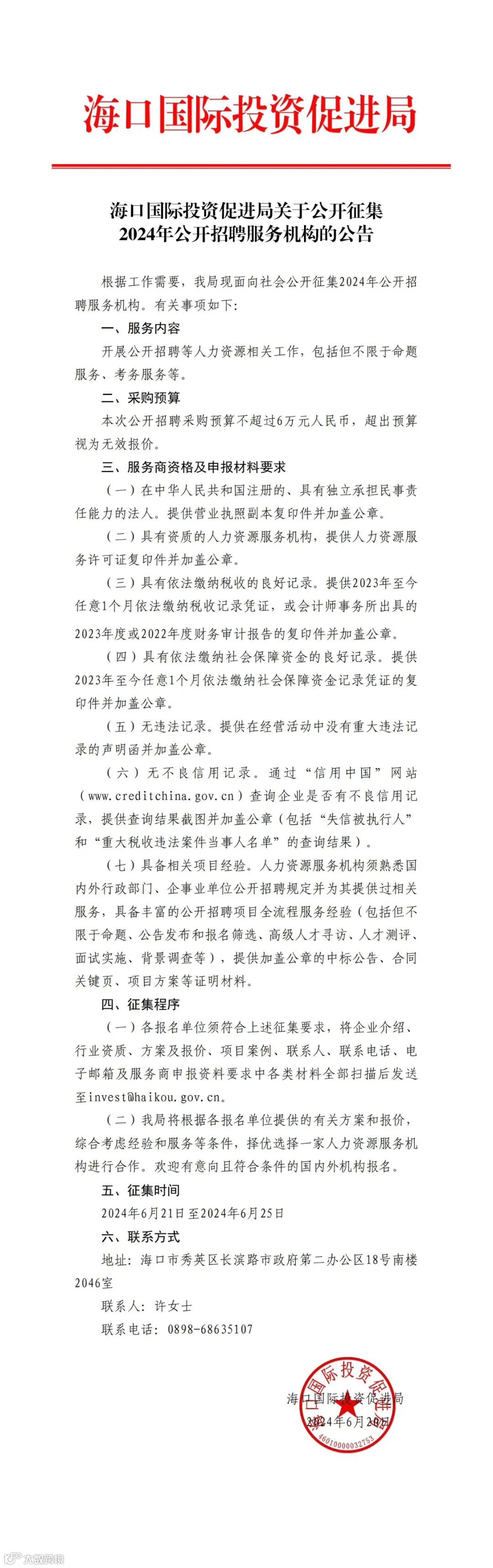 海口国际投资促进局关于公开征集2024年公开招聘服务机构的公告