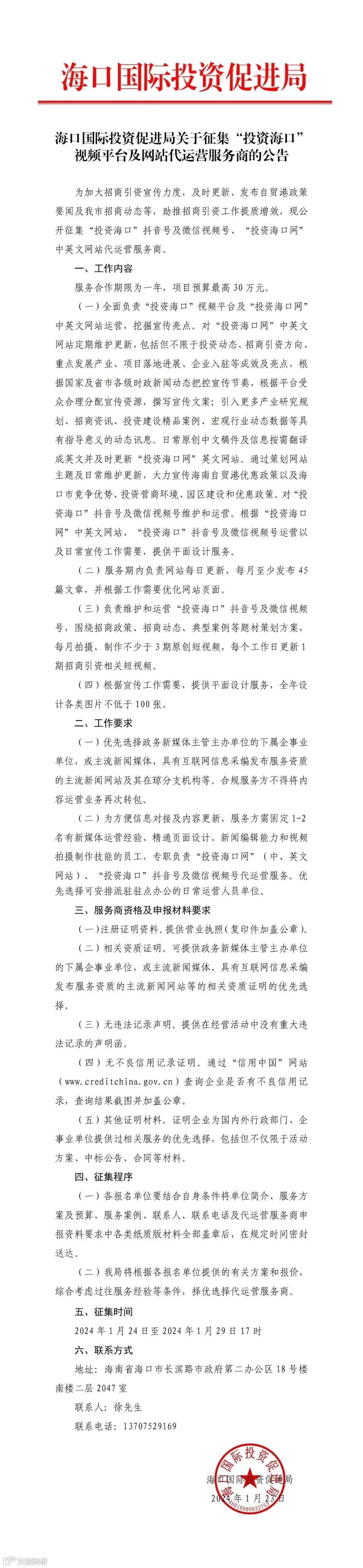 海口国际投资促进局关于征集“投资海口”视频平台及网站代运营服务商的公告