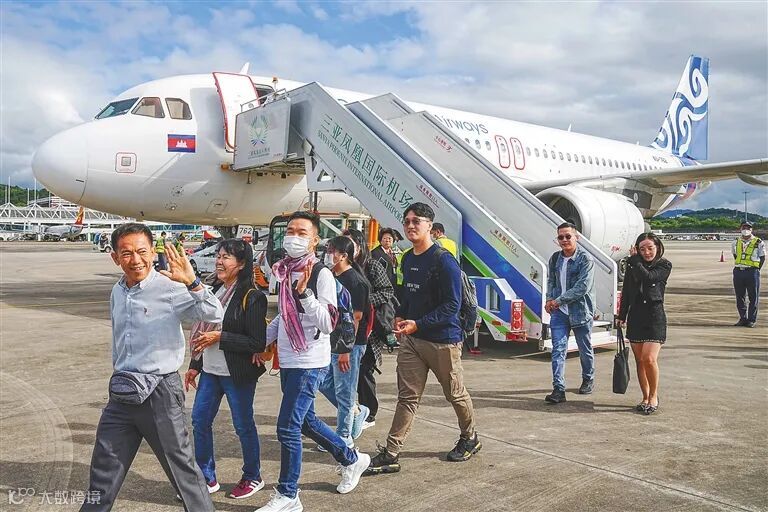 2023年12月1日上午9时许,自柬埔寨金边起飞,由柬埔寨航空有限公司(Cambodia Airways)执飞的KR9755航班飞抵三亚凤凰国际机场。图为来自柬埔寨金边的旅客走下客机。海南日报记者王程龙 摄