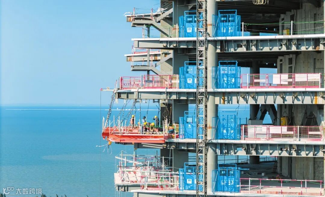 近日,在海南中心项目施工现场,橘红色的“空中造楼机”在蓝天的映衬下显得格外引人注目。在顶模集成平台,3台动臂式塔吊正在作业,工人们正进行钢筋绑扎、钢柱焊接等工作,现场忙碌而有序。