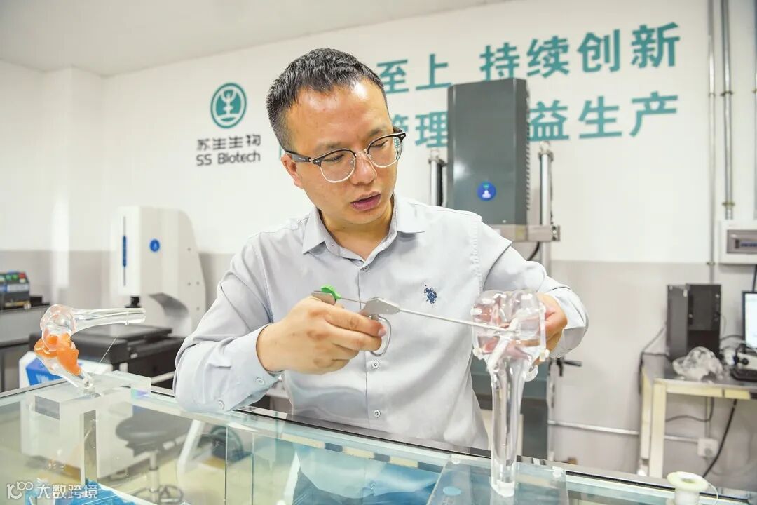 海南苏生生物科技有限公司董事长曾胜向记者展示软组织过线器。