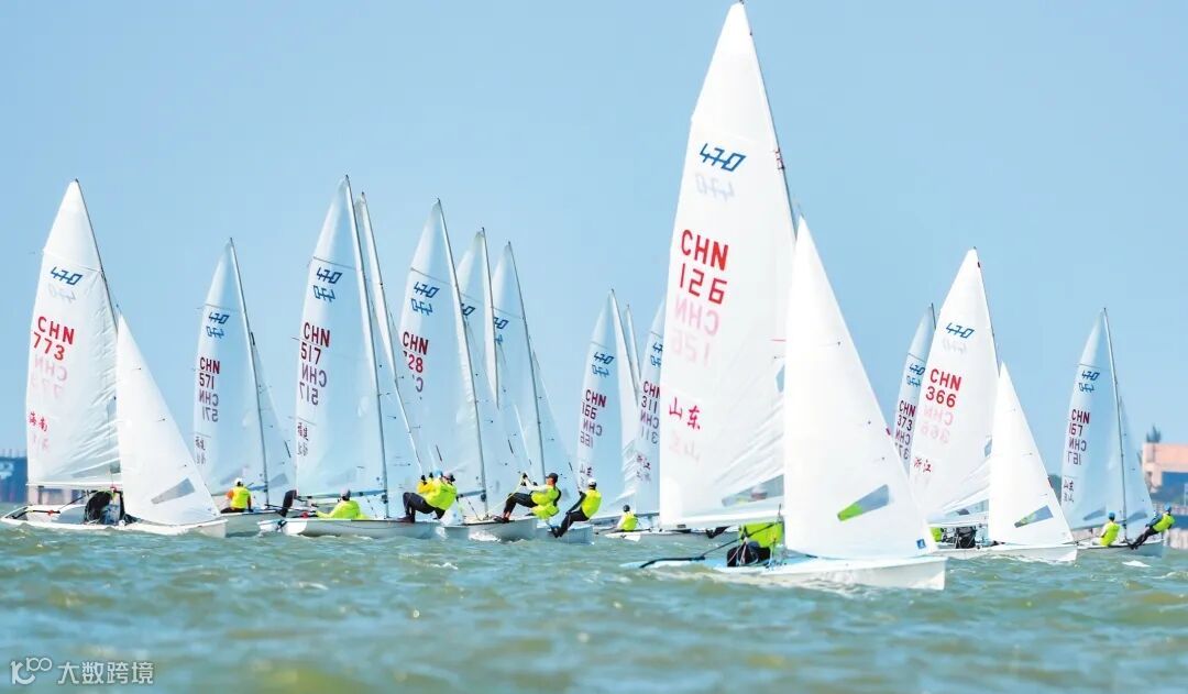 在2023年全国帆船锦标赛(470级)比赛上,参赛选手驾驶帆船乘风破浪,场面壮观。海口日报记者康登淋 摄
