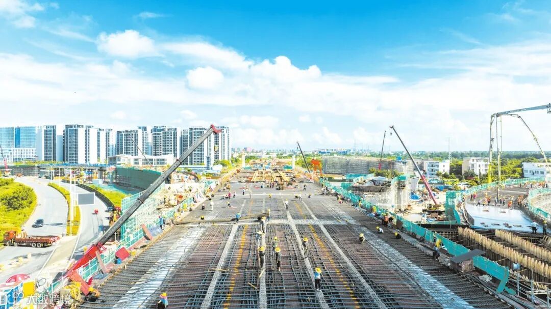 近日,在海口江东新区快速通道项目现场,上百台机械同时运转,开展桥梁上部结构和附属设施的施工。“项目正在全面提速建设,争取9月30日实现通车。”中铁上海工程局海口江东新区快速通道项目总工程师商健介绍,目前,项目总进度已超过80%,预计工期比原计划至少缩短115天。